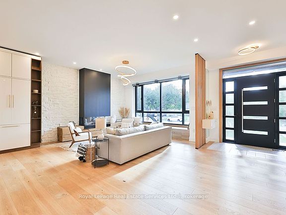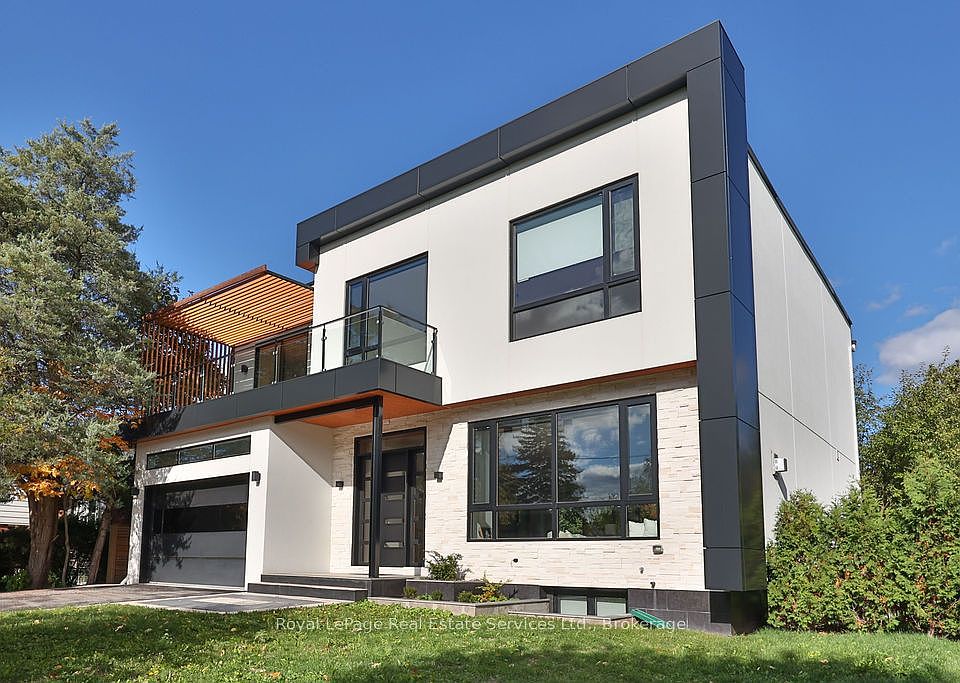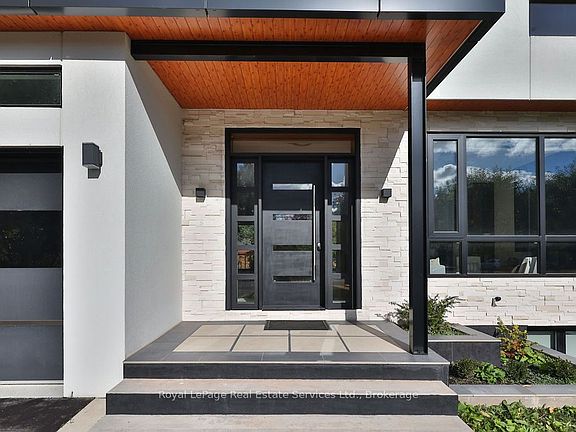 Spectacular custom home, combining West-coast & Scandinavian influences. Over 3300 sqft above grade, light-filled 5 bed, 6 bath with 10' ceilings and salt water pool, set on a quiet street in West Oakville. Appointed with high end & stylish materials throughout including HOPO aluminum windows, doors & steel screens, wide plank hardwood, custom tile work, and upscale modern light fixtures. Impressive white stone + aluminum panel exterior. Custom front door leads to expansive open concept main floor. Living room features gas fireplace set into salvaged looking wooden beams, massive oversized windows and large seating bench with built-in storage. Designer kitchen includes oversized island with quartz counters & integrated Miele appliances. Kitchen & dining room walk out to back deck & pool. Glass walled office includes floor to ceiling windows, custom B/I cabinets & feature ceiling. Floating staircase with aluminum railing leads to the upper level with 10' ceilings, hallway skylights & Polaris chandelier. Primary bedroom features Juliette balcony, accent wall with custom wood paneling, walk-in closet with extensive organizers and ensuite. 5pc primary ensuite with double floating vanity, walk-in glass shower with rain-head & Victoria & Albert soaker tub. Large 2nd & 3rd bedrooms with double closets with extensive organizers, and oversized windows. Main bath features wood accented double vanity, walk-in glass shower & skylight. 4th bed boasts ensuite bath, walk-in closet and walk out to enormous balcony with privacy & shade screens. 5th bedroom features ensuite, Juliette balcony and double closet. Basement includes bar with built-in storage & wine fridge, electric fireplace, large windows, walkout & bathroom. Heated salt water pool (liner & heater 2022), surrounded by stone patio & overlooked by composite back deck with privacy screen and aluminum railings. Double car garage with epoxy floors. Close proximity to lovely Downtown Bronte & Lake, Go train, Schools & Parks.