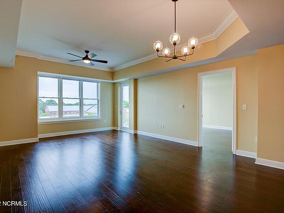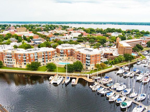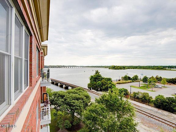 Stunning water views from this top floor condo in the heart of downtown New Bern. This unit boasts high end finishes, and a generous outdoor balcony space, perfect for watching the sunset. Large windows throughout allow an abundance of natural light. Principal suite has a large ensuite bathroom with granite vanity, dual sinks, large tub, and separate shower. Second bedroom has a large closet, brand new carpet, and full bathroom with granite vanity and tub/shower combo. Kitchen has matching Bosch appliances, thick granite countertops, recessed sink, and rich cabinetry. Tastefully decorated with neutral colors, this unit is move-in ready. Sky Sail Condominium amenities include a well-appointed fitness center, private community pool, secure parking garage, entrance lobby, and elevators.