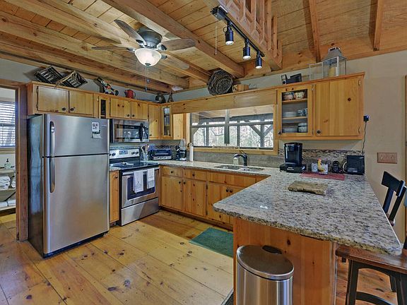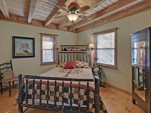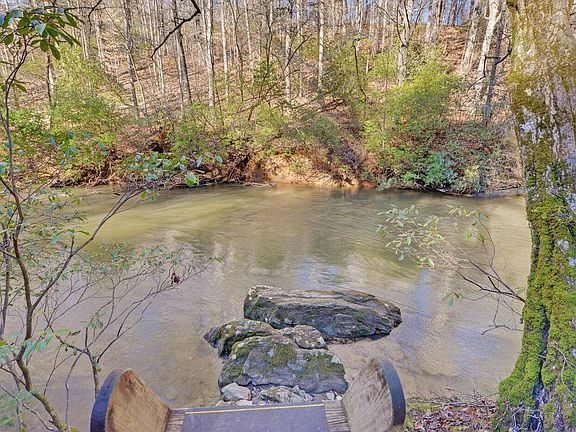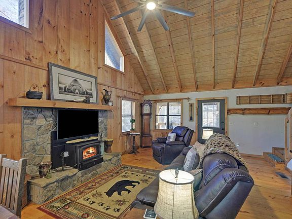 RARE,Gorgeous property on the Toccoa River w/ U.S. National Forest Boundary! Upon walking into this furnished settler's cabin,you will feel at home in the great room cozying up next to the wood-burning insert,Soaring wood ceilings with exposed pine beams.Listen to the rain on metal roof! Wide plank pine floors,large glass door to bring the light in which opens to the over-sized screened-in porch and an open deck at the water's edge.Watch the rainbow trout as you feed them from the deck in a beautifu section of the river with boulders.Only a few easy steps to the water's edge.In the kitchen, you'll find granite counters with lots of cabinets & stainless steel appliances.Master bedroom on the main level,1 Bathroom and Washer/Dryer.Upstairs includes private sleeping loft that overlooks the fireplace. End of the road privacy in a rental friendly neighborhood! Nothing like this available on the Toccoa River!