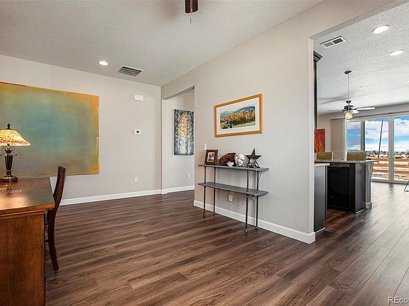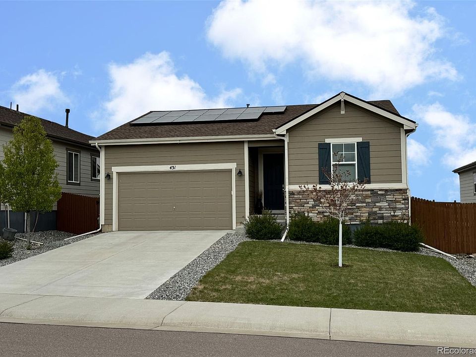 Discover this stunning ranch-style home in Bella Mesa! Built in 2020, this meticulously maintained residence offers nearly 1,400 square feet of modern living space. As you step inside, you'll be greeted by beautiful luxury vinyl plank flooring, soaring 9-foot ceilings, and an open floor plan that flows seamlessly. The light-filled living room features dramatic ceilings and pre-wiring for security and surround sound. The kitchen is a chef's dream, featuring ample natural light, upgraded soft-close cabinets, granite countertops, and a complete suite of appliances, including a new refrigerator, dishwasher, range/oven, microwave, disposal, and washer/dryer. This two-bedroom, two-bathroom haven boasts newer carpet in the bedrooms and a bonus room that can serve as a dining room, third bedroom, study, or workout room. The private main bedroom includes a luxurious en suite bathroom with the potential for a double vanity and custom closet organizer. A new Class-4 roof, along with new gutters and downspouts, was installed in July 2023. Unwind in your backyard oasis, featuring professional landscaping, irrigation, a spacious concrete patio, and breathtaking mountain views—perfect for entertaining. The sprinkler system covers both the front and back yards. For added comfort and energy efficiency, the home includes a high-efficiency water heater, a 96% efficient furnace, double-paned low-emission windows, a sliding glass door, and central air conditioning. New solar panels, valued at over $20,000, were installed in 2022 and are fully paid off, with smart app monitoring and electric bills under $25/month. Enjoy the convenience of being located around the corner from Flagstone Elementary School, Mesa Middle School, and just minutes from the outlet mall. This stunning home won't last long—schedule your showing today!