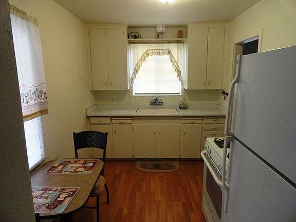 2 bd/1 ba stucco home close to Historical Downtown Plaza, eat in kitchen, large pantry, new paint, wood flooring, ceiling fans in every room, updated bath, covered back patio and detached garage.