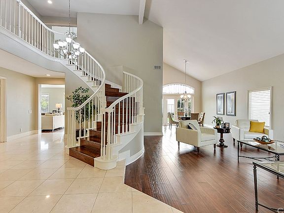 With Catalina views, cathedral ceilings, freshly painted exterior and a 4 car garage, this 5 bedroom 3 full bath Belmont Estates executive home has the wow factor. Step inside the gated courtyard and enter the foyer to a freshly painted interior with dramatic circular staircase, recessed lighting, warm laminate wood floors and an open floor plan. The living/dining area has a marble lined fireplace w/mantle and French doors leading to the private back yard. The remodeled kitchen/family room offers bright white cabinetry topped with grey quartz counters & accented with a glass tile back splash. Appliances include new stainless refrigerator, double oven, gas cook-top & hood and microwave. There is an eat-in area and extensive storage and counter space. The family room has a second fireplace and expansive wet bar for entertaining. A second set of French doors leads to the back yard built-in outdoor BBQ area. There is a downstairs bedroom, adjoining full bath and large laundry room - washer & dryer included. The upstairs Master Suite has high ceilings and a wall of windows across the back wall. The master bath features a walk-in closet, dual vanities, oval tub with canyon views and a large separate shower. There are two smaller bedrooms and a massive bonus room with walk-in closet that can double as a second master bedroom. Nohl Canyon Elementary, Cerro Villa Middle School and Villa Park High.