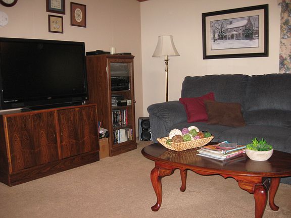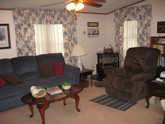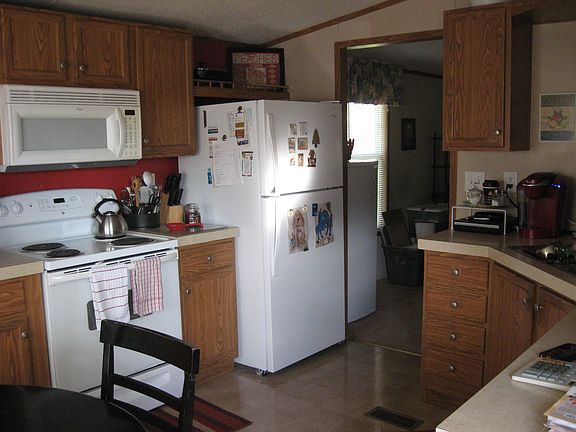 Well kept! Spacious three bedroom 2 bath home. Eat in kitchen with updated electric range built in microwave, dishwasher, new refrigerator with ice maker, separate dining room, living room with classic pellet stove that will heat up to 2500 sq. ft. with thermostat and laundry room. Master bedroom has walk in closet, master bath with jetted tub and separate shower. New roof with lifetime warranty, propane heating, central a/c, 5 ceiling fans and an outdoor shed. Lot rent $734/mo includes water, sewer, trash and snow removal.