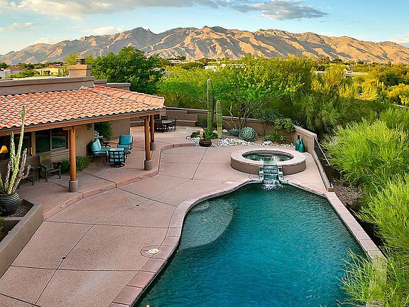 Welcome to this stunning home in the prestigious, gated community of Bellas Catalinas Estates. Set on one of the largest lots, this property offers unparalleled views of the Catalina Mountains and sparkling city lights, creating an idyllic setting for relaxation and entertainment. Step outside into your private oasis, a resort-like backyard featuring a sparkling pool with a cascading waterfall and an elevated spa. Warm up near the outdoor fireplace while taking in the 3 different mountain ranges. The expansive covered patio, invites outdoor living year-round, surrounded by meticulously designed landscaping that enhances the home's charm. The remodeled interior features a spacious, open-concept design, ideal for everyday living. The dining room is located near the kitchen, and both the family and living rooms are spacious and offer a warm fireplace. The gourmet kitchen is a chef's dream, with an abundance of granite countertops, a large island with prep sink, and top-of-the-line appliances. Whether cooking for family or hosting guests, this kitchen is both functional and stylish. Designed for privacy and comfort, this home boasts a desirable split-bedroom floor plan. The primary suite offers a peaceful retreat with a remodeled luxurious bath and walk in closet. You also find a well-appointed quest quarters, with its own entrance, providing privacy for visitors or multi-generational living. A spacious 3 car garage with extra workshop, provides ample storage, while a circular driveway adds plenty of additional parking space. With its combination of stunning views, luxurious amenities, and custom finishes, this home offers the ultimate in Southwest living.