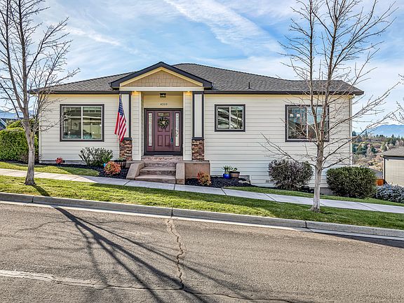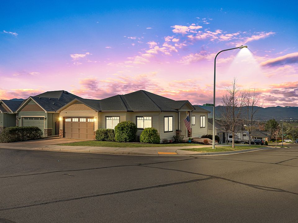East Medford treasure in Vista Point offers an open layout with a kitchen boasting granite countertops, double oven, stainless appliances, and wood floors. The dining area presents stunning views of hills and city lights. A spacious great room with a gas fireplace and deck with gas hookup for grilling enhances outdoor living. The master suite features deck access, a walk-in closet, and a bathroom with granite countertops and dual vanities. Extras include a versatile attached room for hobbies or extra space, ample storage, and a corner lot with a side-entry garage. Solar panels added in 2021. HOA covers all landscaping. New city park 1 block away.