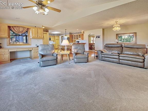 Stunning Pikes Peak and front range views, with ideal location at the end of cu-de-sac, backing up to green belt walkway, in established, centrally located neighborhood of Village Seven. Get creative with all the space and unique rooms that can be used in multi-purpose ways. Main room could be a large dining room or formal living room, large kitchen features great counter space and eat-in/built-in breakfast nook. Family room boasts custom built-in cabinets and entertainment center, with bay window for viewing the expansive mountain views. Upper level has 2 bedrooms with bathroom and master bedroom with en-suite 3/4 bathroom. Lower level has a second large family which leads to a basement with 2 additional bedrooms, an exercise room, laundry room and tons of storage closets. The 2 car garage is oversized and additional parking in driveway is extra long. Backyard is massive, surrounded by beautiful mature trees, a substantial poured concrete area with a basketball hoop and lots of grass. Carpets will be stretched and cleaned prior to closing.