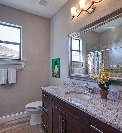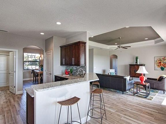 Just completed in October, 2016! This beautiful 4/2 home will surely catch your eye! Highly functional floor plan with flex room which could be used as another dining area, office, play room, or formal living area! Elegant front elevation with stone accents, stunning leaded glass front door, and rounded columns. Interior features volume tray ceilings with crown molding in great room and master bedroom, sleek, upgraded wood cabinets and granite counter tops throughout, tile wood floors, and wood window sills. Spacious Master bath with oversized shower, his and hers vanities, and huge walk in closet. Decorative, easy maintenance, porcelain tile in main living areas. Alarm system, irrigation system, brick paver driveway and walkway included. Peaceful, nature oriented subdivision with lush landscaping, ponds with fountains, playground, club house, community pool, basketball, and tennis courts. Quick and easy access to I-4. One time HOA initiation fee is $1,250. Listing agent is related to Owner.