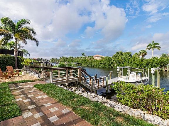 Welcome home to Bella Sole, a pristine boating community with an exclusive island feel, surrounded on both sides by saltwater canals. Watch dolphins and manatees playing from dock with boat lift. Enjoy the sunsets from your heated salt water pool & spa. Upon entering this beautiful West Indies inspired home through your gated courtyard garden, you'll soon discover that this 4 bed 3 bath home possess over $100k in upgrades and options! Designer touches include plantation shutters, sliding barn doors, wood style tile flooring, free-standing pedestal master bath tub, gourmet kitchen, and upgraded cabinetry with granite counter tops. This unique floor plan provides stunning views of the open land on Hawk Island thru pocket sliders. The home is complete with an extended lanai, full pool bath and outdoor kitchen with sink, refrigerator, keg-orator and built-in grill for cooking your fresh catch of the day. So you want to dine out? Great, it's a short boat trip to many restaurants along the River, Bay or Gulf. This home is perfect for a family or as a vacation home with a custom Jack and Jill bath, giving you 3 en suites, instant hot water heater, upgraded SS appliances, washer/gas dryer and extended paver driveway with space for 8 cars plus lots of big boy toys in the over-sized garage with workshop area. Boaters, you would also own the 109'+ waterfront in front of the house too. How sweet, his and her canals. Drop anchor here and live the tropical life of your dreams. Call us today for your personal viewing.