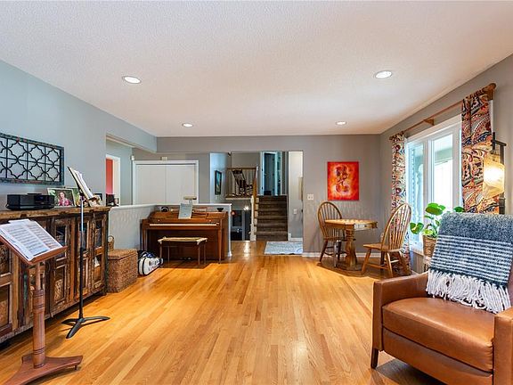 Great family home on large half acre lot in desirable location Large formal living and dining rooms. Eat in kitchen with breakfast bar and sliding door to deck overlooking the yard. Big family room with walkout through the three seasons room featuring accordion windows for great air flow. Great southern exposure. Family room also features a gas fireplace and a wet bar. Lower level recreation room would make a great crafts area or home theater. Newer furnace and air units, comfortable zoned heating and cooling. Newer roof. Store your yard items in the backyard storage shed.