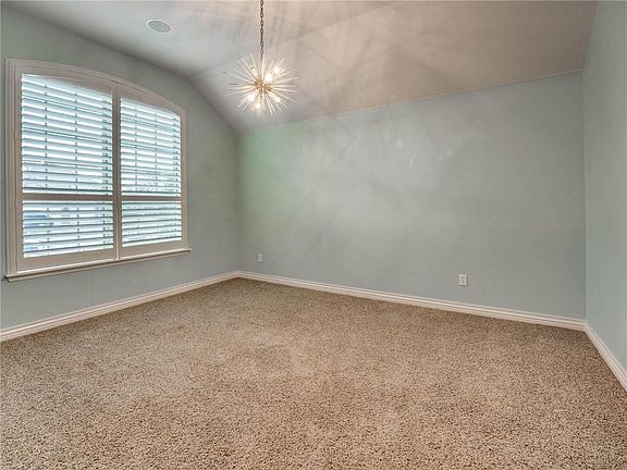 Wow, this home and neighborhood have it all!! Open floor plan, beautiful hardwood floors, electronic remote controlled shades in the living room, wooden shutters throughout, jacuzzi tub in the primary bathroom, insulated garage doors, storm shelter, new dishwasher installed 2022, new roof and gutters 2021, oversized hot water tank, quartz countertops, HUGE covered back patio that's shaded in the hot Oklahoma evenings, built-ins, gorgeous stained wood and island in the kitchen, formal dining area, gas hookup on the back patio, office space, and even a flex room!! Your new home is also wired for surround sound!