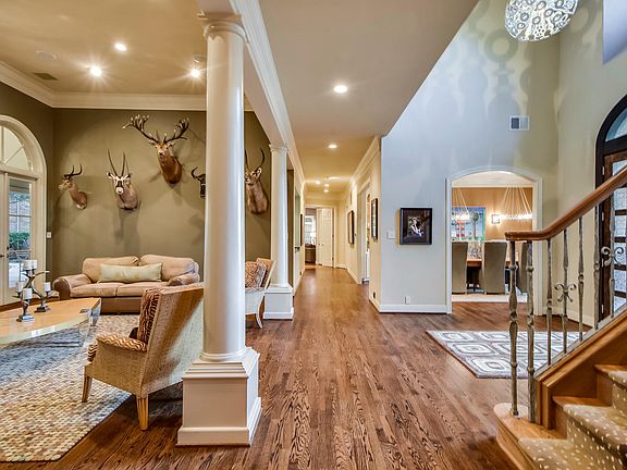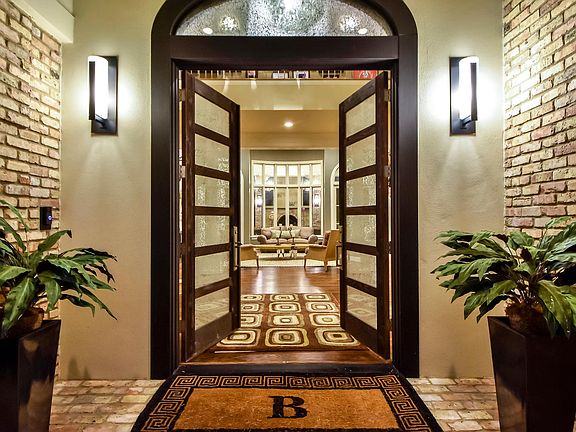 The elegant exterior entices you into a soft contemporary home with a floorplan for family fun. Wide open kitchen with oversized granite island, glass-tile back splash, split river rock floors, stainless steel appliances, and storage galore. Huge master suite located on main level with exquisite master bathroom remodel. Bathroom suite includes steam shower, soaking tub, double vanities, coffeemaker hutch and undercounter refrigerator. His/Her open concept closet space includes seasonal storage racks and beautiful built-in storage. Media room with theater seating and snack bar. Four bedrooms and playroom are upstairs. Utility room with dog kennels and shower off of kitchen as well as additional laundry facilities upstairs. Beautiful flat lot, intimate outdoor living space with fireplace and outdoor kitchen. Pool design from architect included.