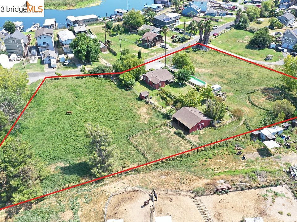 2 acres of lush green farm land is the backdrop to this super cute little dollhouse. The entry of the bricks, plants, hummingbirds and flowers will great you upon your arrival. The home is quaint and cozy with 2 bedrooms and 1 bathroom. Kitchen opens to a dining area and wood burning stove. There is a barn on the property for animals or storage. Pastures are fenced. Check with the county for main home to be considered adu, with plenty of room to build another larger home. Located across the street from the CA Delta and down the street from the new Delta Coves.