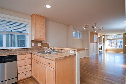 Stunning Fremont Townhome! Superb Craftsmanship throughout: Newly refinished oak floors plus extensive painted millwork. The Gourmet Kitchen includes Maple Cabinets, Granite Countertops and Stainless Appliances. Living Room includes high-end lighting fixtures & Gas fireplace. Private roof top deck w/views of space needle, City, lake & Mt Rainier. Master Bath includes jetted tub, skylight, dual vanity & limestone tile floor. juliette balcony off large master bedroom with 2 closet...
