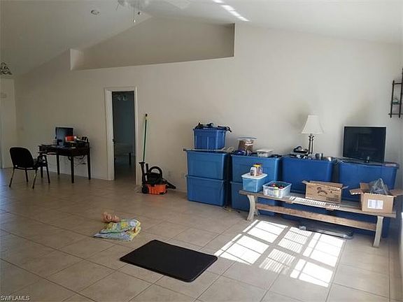 This nearly new home with assessments in and PAID, features tile floors through the entire home (no carpet), open concept with split bedroom floor plan, large master bedroom with patio doors to lanai and his & hers walk-in closets, master bath has ample storage and large counter with dual sinks. Huge under truss screen lanai, with guest bathroom access, overlooks the sprawling fenced yard with lots of privacy and plenty of room for your future pool! Excellent location with quick access to Veterans and Cape Coral Pkwy, close to shopping, dining, and entertainment.