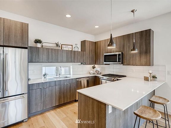 Incomparable luxury townhome with a million-dollar view of cascades, Mt Rainier, Union lake & Space Needle! from private roof deck+garden space! Live&Work in the desirable Fremont w/Walkscore 90+,yet a peaceful neighborhood! Corner unit w/attached garage. Showcase kitchen w/ all KitchenAid appliances, soft-close cabinets, centerpiece quartz island+walk-in pantry. The wide layout boasts oak hardwood & a ton of natural light through great room windows. Carpet throughout upper fl. Master bedroom has mini-split for yr-round comfort plus walk-in closet&ensuite master bath w/ double vanities. On-demand tankless water heater. Fresh paint&Steam clean carpet. Minutes walk to coffee shops, bistros & pubs, Green Lake &more. Walk/Bike to work! No HOA.