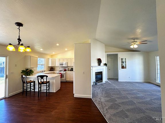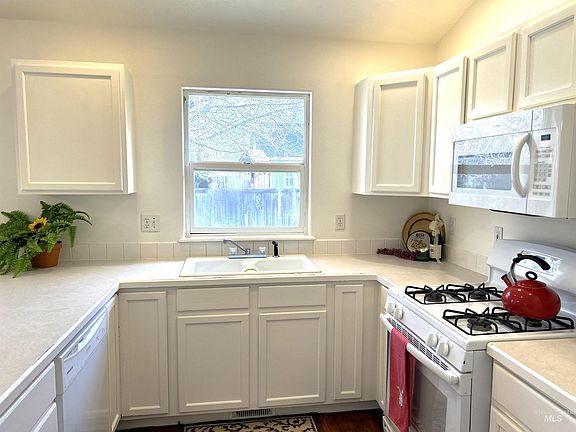 Delightful home in a convenient location has Fresh Paint & New Carpet! Exterior was painted 2020 and a New Roof in 2021! Attractive custom corner fireplace, split bedrooms, vaulted great room & loads of light enhance the desirability of this home! Enjoy the generous sized Sunny Morning Kitchen which has plenty of storage. Pantry, gas range, new microwave & breakfast bar. Move in ready! There is no wasted space in this "Easy Living" home. Fully Fenced shaded East backyard has garden space and grass area. Front Covered Porch has 105 sf offering a roomy place to Relax! New Garage Door spring 2022. New HVAC Control Board, Flame Sensor Cleaned 4/2023. Smoke alarms have been checked. Easy access to Eagle, McMillian, Cloverdale or I84 for school or commutes. Close to the Foothills and roads to the Mountains for Miles of Recreation! 10 Miles to Downtown Boise! Healthcare, Coffee, Shopping, Restaurants, Parks, Schools, Costco and The Village are nearby.