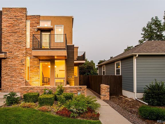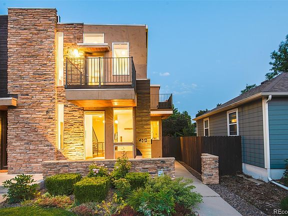 Welcome home! Having been tastefully updated, this Berkeley townhome presents the perfect blend of urban living with contemporary style and conveniences. Guests are greeted by the stunning open staircase and a free-flowing floor plan as you move through the naturally lit main level. Double-stacked quartz countertops, marble backsplash and newer SS appliances adorn ample soft-close cabinetry in the kitchen, while the dark hardwood floors throughout extend into the spacious living room, 1/2 bath, and dining room with a built-in dry bar + additional espresso cabinetry. Retreat to the master bedroom featuring high ceilings, automatic blackout blinds, a generous customized pass-through closet with his/her entrances, reading nook and a private balcony. The open concept master bath is highlighted by a grand Euro glass shower, tiled double vanity and separate water closet. An open loft area, conveniently located laundry room, spacious secondary bedroom with en suite full bath, and 2 more private balconies round out the 2nd floor. Venturing downstairs, the basement boasts a large extra living space, an adorable Harry Potter-style closet, two more sizable bedrooms and a full bathroom, ensuring ample room for a growing family and/or overnight guests. Colorado's amazing weather is a big reason why most people live here, so enjoy it from the recently upgraded composite deck enriched with shade sails and bistro lights creating the ideal private setting. Hurry and come visit this beautiful Berkeley home, you won't want to miss this amazing opportunity!