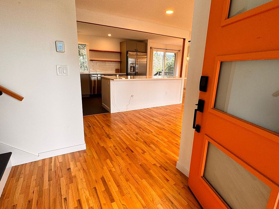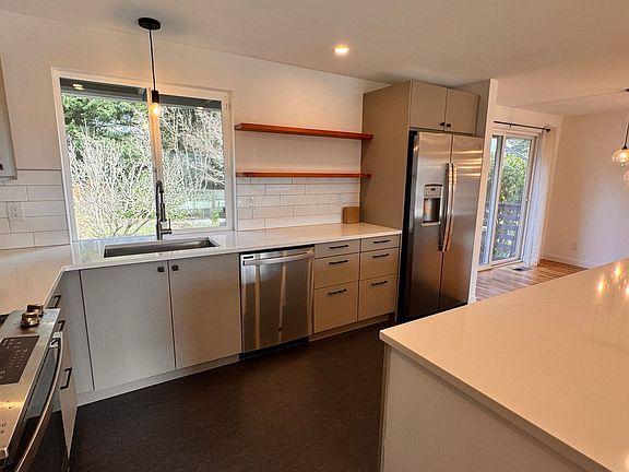 The main level features a bright and open floor plan with high ceilings, seamlessly connecting the living room, kitchen, and dining area. A sliding door leads to the deck, perfect for outdoor enjoyment. This level also features three spacious bedrooms and two beautifully updated bathrooms. The lower level offers a generously sized room with its own sliding door to the backyard, could be used as a fourth bedroom, home office, or bonus space. Lower level also features third bathroom and utility area. Two-car garage with extra storage, pre-wiring for EV charger. Fully fenced private backyard with mature landscaping, raised beds for vegetable gardening. Yard maintenance included in rent. Nestled on a quiet cul-de-sac with easy freeway access, this home offers both comfort and convenience. Terms: First month's rent $3,500 and refundable security deposit $3,500. Pets considered on case by case basis. No smoking and no daycare please.