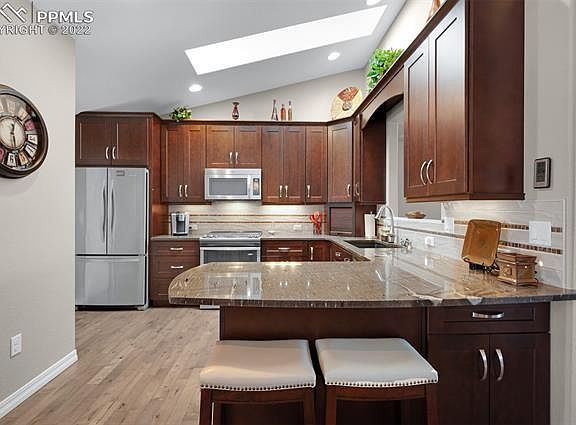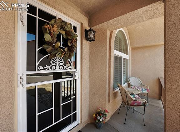 Immaculate main level living townhome loaded with so many custom upgraded features! Ranch floor plan with walkout basement with mountain views for days! The main level includes the master bedroom with a custom walk-in shower, walk-in closet with built-ins, another main level bedroom that is currently serving as an office with and additional main level 3/4 bath. Maple wood flooring in the main level kitchen, great room and dining room. Upgraded carpet with 8lb pad. Ceramic tile in all the bathrooms. Custom tile work throughout. Motorized blinds and wood shutters on the main floor, natural gas line on the extended trex deck, along with a beautiful linear fireplace with stone to the ceiling. Kitchen has beautiful 42-inch cabinets with crown molding, granite countertops and a very large counter height breakfast bar. Kitchen also has upgraded appliances and beautiful hardware throughout. Main level laundry has an additional sink and extra cabinets for storage. In the walkout basement, you will find an additional family room with a flex room, another bedroom and a full bath. Master and lower bath have radiant floor heating. Garage is fully finished with an additional water spigot, and additional electrical outlets. Storage room in basement is 10x20, with extra shelves and plenty of room for all your storage needs. Full house surge protector, Nest thermostat and Ring doorbell are included. Tile roof and no maintenance exterior, along with a driveway that faces the sun, 3 guest parking spaces right next to driveway, and windows in master, great room and upper bedroom all boost views of Pikes Peak, as well as the walkout deck. This home is pristine and a must see!