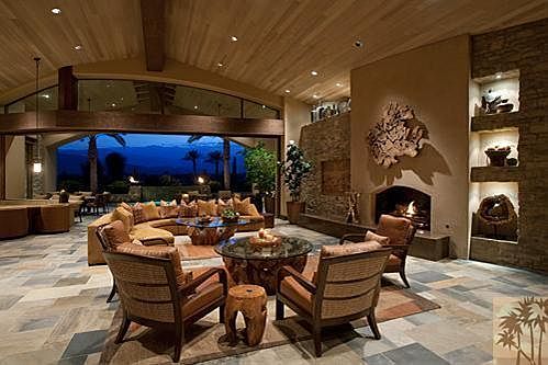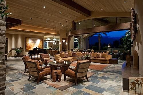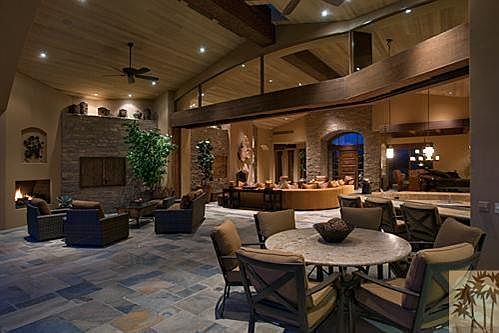 This stunning estate home is nestled quietly behind the private gates of Toscana. The clean lines and intricate details of this home are infused with Old World charm, including natural slate floors and vaulted handcrafted wood ceilings. The drama of the grand Great Room is breathtaking with its oversized, motorized glass pocket doors that seamlessly merge the grand indoor and outdoor elements. They open the entire back of the home to an expansive outdoor entertaining pavilion with breathtaking southern views of the Jack Nicklaus Signature South Course, Mount Eisenhower and the San Jacinto Mountains. The indoor spaces are equally magnificent with a gourmet kitchen complete with the finest appliances, a luxurious master retreat with home office, exercise room. Guests can enjoy either the guest suite and bath or the spacious guesthouse with 2 bedrooms and baths, a living room and patio. The lower level includes a spectacular home theatre, billiards room and 1,000 bottle wine cellar. Brokered And Advertised By: Toscana Homes, Inc. Listing Agent: Judith, Jamie, Linda, Charlene