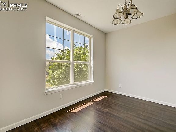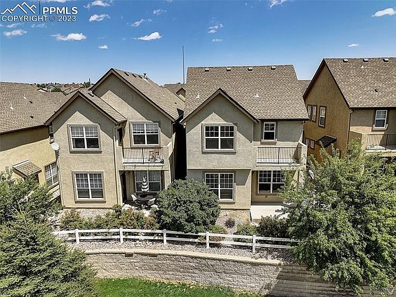 UNOBSTRUCTED VIEWS!! This exquisite 3-bedroom, 2.5-bathroom residence spans 1,578 square feet, has views of Pikes Peak and the whole mountain range that is highly sought after. Engineered wood is throughout the home for easy maintenance. The updated kitchen, boasting a wine refrigerator, apron sink, and premium Frigidaire appliances, to include a gas stove/oven and white cabinets. The family room has a gas fireplace and new paint throughout the entire home. The master bedroom features a vaulted ceiling and a private balcony facing the majestic mountains. A double vanity, shower and walk-in closet finish out this retreat. The flexible room, whether utilized as an office, kids' playroom, or second family room, adapts to your family's needs. The two-car garage is upgraded with an epoxy floor finish, turning it into a clean, organized space that complements the home's appeal. It's prime location is adjacent to Springs Ranch Elementary School and close proximity to Peterson and Schriever AFBs. The ease of access to Powers Blvd connects you to a wealth of conveniences, from shopping to dining and entertainment. The gated community offers a range of amenities, including a swimming pool and exercise room, enhancing your everyday living experience.