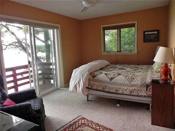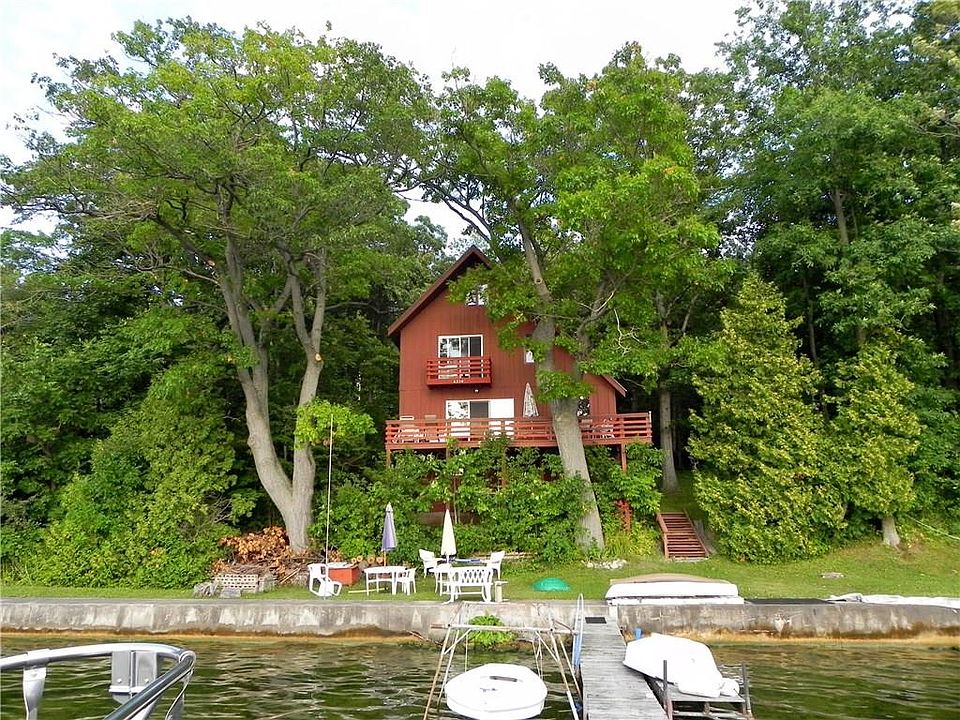 Best of both worlds! Incredible 150 feet of waterfront with the best breakwall on the lake yet the property affords wooded privacy! Nature lover's dream! Great separation from adjacent properties. Gorgeous A-frame design with $63K worth of improvements since 2015! New roofs; reframed/resupported 2 story gar; regraded driveway to receive final paving coat shortly; new sliding glass doors; new gas fireplace; new landscaping and retaining wall, much more! Cherry kitchen; finished 3rd flr allows for lots of guests; 2nd flr laundry; walkout basement; includes all appliances! Refurbished boat hoist, sailboat, ski boat, other watercraft are all negotiable! Wonderful environment to relax in; gorgeous views off multiple decks, good water depth off the dock. Width of lot allows for future expansion.