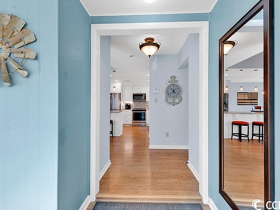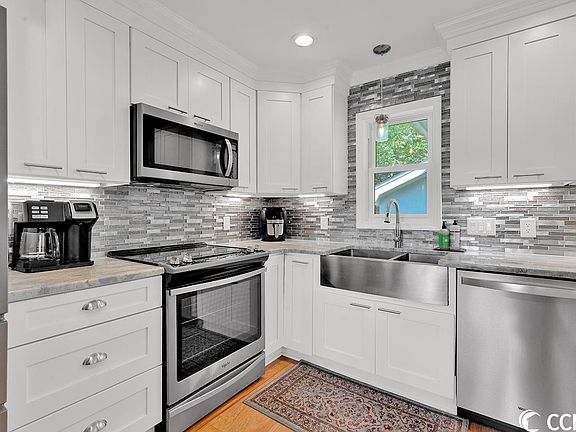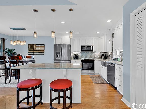 Welcome home to this attractive two bedroom two bath gem centrally located in the heart of Myrtle Beach, just minutes from beaches, shopping, schools and dining. Step inside to find fabulous details throughout the inviting open concept design, which has enjoyed many improvements in recent years. The remodeled granite kitchen is the focal point and is beautifully appointed with Shaker style soft close cabinetry, center island with storage, intricate tiled backsplash, farmhouse sink and stainless steel appliances. The vaulted great room with fireplace is charming as is the open dining area featuring glass sliding doors that lead to a patio. Both bathrooms have been updated as well presenting stunning tiled showers with glass doors and vanities with vessel sinks that truly compliment the spaces. There is also a front room that could easily be used as a home office or additional seating area. Like to entertain? A sizable pergola covered side deck for gatherings with friends and family enhances the outdoor living. Roof replaced in 2020 and complete window and exterior door replacement in recent years. Don't miss the attached rear exterior storage and fenced area.