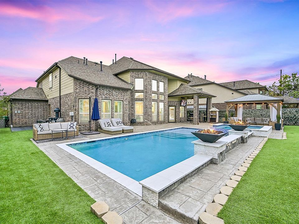 Gorgeous home in Sedona Lakes featuring an exceptional backyard oasis. Designed for both everyday living & entertaining, the outdoor space features a pool & spa, two covered patios, & artificial turf that allows for low-maintenance & excellent drainage. Inside, soaring ceilings & a wall of windows create a bright, open-concept living space filled w/natural light & views of the backyard. The gourmet kitchen boasts abundant cabinet space, a center island, beautiful finishes, a breakfast nook, & direct access to the formal dining room. Upgraded wood-look tile flooring extends throughout the 1st floor. The primary suite features a wall of windows that overlook the backyard & a luxurious bath. Upstairs, entertainment options abound with a media room w/surround sound & a spacious game room that has a stylish built-in bar. 3 car attached garage. Situated on an oversized cul-de-sac lot within the highly desirable Sedona Lakes community, w/easy access to 288, Hwy 6, & more. Don't miss this one!