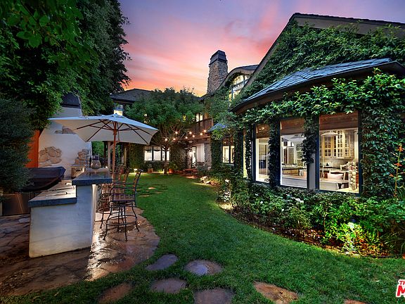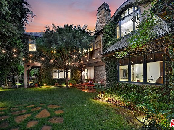 This French Country estate is nestled beautifully amongst some of Toluca Lake's most exclusive properties. The well-appointed home has a masterful floor plan, rich with architectural detail and spacious living. Unique characteristics include travertine entry floor outlined with striking pecan flooring. Living room features solid pecan planked flooring, tongue & groove ceilings with solid hand hewn beams and a Santa Barbara stone fireplace. Gourmet kitchen features Brazilian green granite counter tops, custom cabinets with antique blown glass, hand painted Italian tiles, and dramatic ceiling trusses. The master suite has two closets, a fireplace and Juliet balcony overlooking the backyard. Master bath includes a massage tub, double vanity and steam shower. Two spacious bedrooms connected by Jack & Jill bath. Large office with 1/2 bath, wood vaulted ceiling with structural beams could serve as 5th bedroom. Saltwater pool & waterfall/spa, 3-car garage, Close to studios and Toluca Village