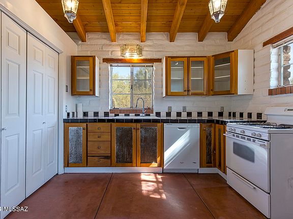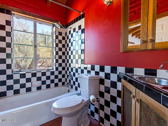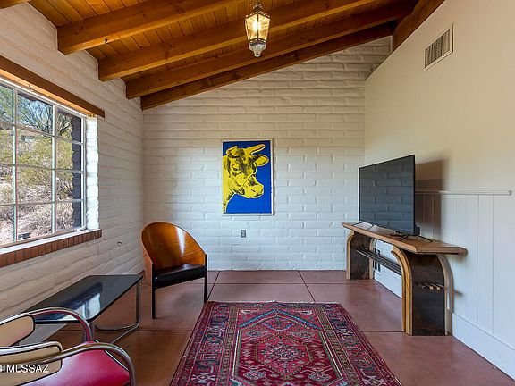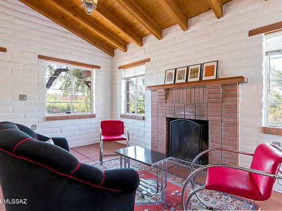 An extraordinary combination - high quality, compact living and a prime location at an incredible price in the lower foothills--an enchanting one-of-a-kind classic Tucson adobe retreat. This home offers a captivating aesthetic, where rustic elegance meets artistic flair. Vaulted, beamed ceilings stretch high above scored concrete floors, while custom punched tin accents lend a touch of handcrafted beauty. Built in 1993, this timeless home boasts classic details like a tile roof, elegant lintels above the windows, a fireplace, generous bedroom size and custom lighting that brings a soft, inviting glow to every room. Step inside, and you'll feel the cozy warmth of a space designed for both comfort and inspiration. The versatile second bedroom transforms (SEE MORE) easily into a den or library. The single bath is a striking focal point, featuring custom black-and-white tile complemented by bold red walls. The open-concept layout allows for multiple uses of the space, providing flexibility for living, dining, and entertaining. Freshly painted inside and out, the home is move-in ready, with custom closets and a dedicated laundry closet adding thoughtful convenience. Mature east side Mesquite tree frames the front porch, offering a shaded outdoor space. Surrounding yard is a palette of potential and creative vision. Just a few blocks away, the best of Tucson awaits. Take advantage of biking along The Loop, walk or bike to the Tucson Racquet Club minutes away, and enjoy shopping and dining at St. Philips, Trader Joe's and all along the Campbell/River's bustling commercial corridor. Situated in a highly desirable location, this home is a rarity indeedan intimate sanctuary nestled in a big, vibrant location.