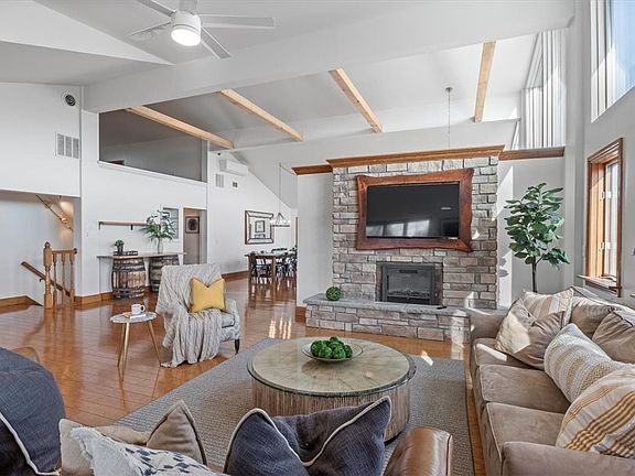 - Breakfast Bar, Ceiling Fan(s), Cathedral Ceiling(s), Entrance Foyer, Eat-in Kitchen, Living/Dining Room, Sliding Glass Door(s), Storage, Solid Surface Counters, Natural Woodwork, Bedroom on Main Level, Loft, Main Level Primary, Primary Suite, Programmable Thermostat