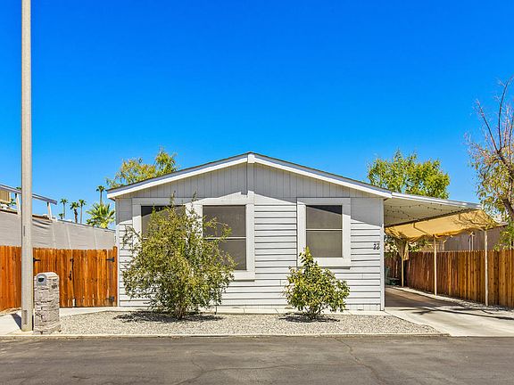 Discover this beautifully remodeled 3-bedroom manufactured home, a true gem nestled on its own land with a permanent foundation and a new roof. Step into an inviting open floor plan that features a spacious great room with a cozy fireplace, perfect for relaxing or entertaining. The kitchen is a chef's dream, boasting Euro white cabinetry with custom hardware, a striking black and white tile backsplash, quartz countertops, a farmhouse sink, and stainless-steel appliances. This home is designed for comfort and style, with shutters and ceiling fans throughout, ensuring a pleasant ambiance in every room. The convenience of indoor laundry with an extra storage area adds to the practicality of this home. The primary suite is a sanctuary, stylishly updated with custom black and white tile for a touch of elegance. Residents will appreciate the low HOA, which includes water, trash, cable TV, internet and more. Perfectly situated near El Paseo, you'll have quick access to premier restaurants, shopping, and schools. Don't miss the opportunity to make it yours!