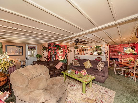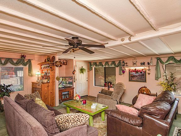 Another cozy custom Manufactured Home in the gated community of Portola Palms in the heart of Palm Desert. This beauty offers a gorgeous Greene entryway into 2bd, 2ba interior, with an open floor plan, featuring a mix dining and living area with lots of natural lights, pull downs curtains, including a computer area , and a nice decorative fireplace with wood beams on ceiling. Kitchen offers counter tops and a built in area for the stove, every detail in, is customized, walls are custom finished painted . In Master bd you'll find decorative glass walls, and closets, a bathroom with tile walls and floor. Back door from living area walks you towards back patio and a nice balcony with beautiful mountain views. Home is all fenced and has a large space can be used to build an extra bedroom. Carport floor with brick pavement covering 2 cars. Exterior front and back is decorated with rocks on floor and live green plants & lots of colorful flowers. Laundry room outside, newer AC & Swam cooler. composition roof, treated every year with roof coating. Low association fee covering basic cable, water, and trash. The most good of this is YOU OWN THE LAND. Virtual Tour On!!!