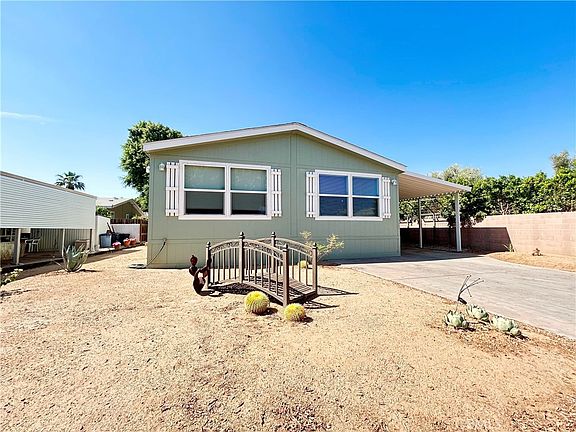 Come check out your new home in the serene community of Portola Palms! Built in 2022, this beautiful manufactured home offers the rare opportunity of OWNING THE LAND. The permanent foundation is considered 'real property' making this home eligible for home lending! Located in a GATED FAMILY COMMUNITY with a low HOA fee of $330 per month, this property combines affordability with comfort and convenience. This home features 3 bedrooms and 2 baths, with a modern interior including an in-home laundry area. Step outside onto the side deck patio, leading to an extra room outside, complete with insulation, swamp cooler, and light fixtures. Situated very close to Palm Desert schools, shopping centers, and essential amenities such as banking services, this home ensures easy access to everything you need. Enjoy community amenities including a refreshing pool, and a sports court for recreation. HOA benefits include cable, trash removal, and water service, simplifying your utility management. Don't miss out on this opportunity to own a piece of Portola Palms. Schedule your viewing today and imagine the possibilities of making this house your home!