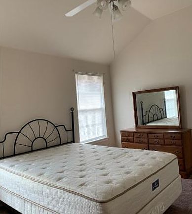 $200.00 per month discount on rent for all military -1316 square foot furnished patio home located 1.5 miles from the Sooner gate on Tinker AFB. Three bedrooms, two baths with large closets and walk-in closet in Master bedroom-cathedral ceilings-window blinds-two car garage. Furnished with washer, dryer, refrigerator, stove, microwave, dishwasher, queen bed with dresser and chest of drawers, full size bed with dresser, and twin bed with dresser and desk. Living room is furnished with leather couch and 2 chairs, bookcase, coffee table, ottoman with dining room table and four chairs. Stockade fence with patio and battery- operated lawnmower and edger. Double car garage with remote controlled garage door opener. Alarm system. First and Last month rent plus $1000.00 cleaning deposit with a one year lease. Renter pays for all utilities and is required to maintain lawn-battery opperated lawn mower and edger is provided for renters use