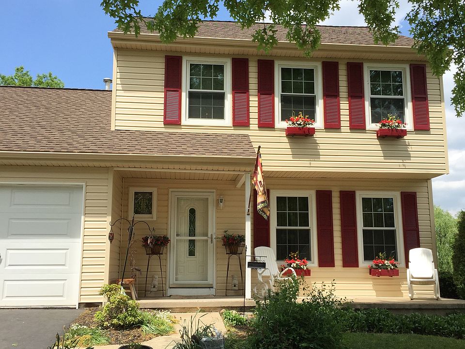 Welcome to this cute 2 story colonial in Pheasant Run. As you enter the front porch with window boxes below the windows you are invited inside to a nice size living room that opens to a large eat in kitchen with granite counter tops and tile backsplash and all stainless steel appliances included with the home. There are plenty of cabinets and counter space for lots of storage and work space. Updated laminate floors show continuity through out the first floor. Off the kitchen is a family room with vaulted ceiling and a tile surrounded wood burning fireplace and sliders to a deck with retractable awning for entertaining. The yard is fenced in for pets and a shed beyond the fence is included also. Next to the kitchen is a updated tile floor half bath with laundry area and the one car garage has been finished into another bedroom but the garage door is still intact. It could also be an office too. Upstairs you will find 3 nice bedrooms with a full updated bath. This home has a new roof in 2013, all new triple pane windows and new vinyl siding in 2015. The HVAC system is updated recently also. The basement is a blank palette to finish for additional living space. This house is located among mature trees and landscaping and ready for immediate possessions.