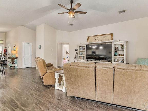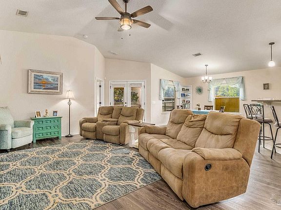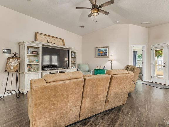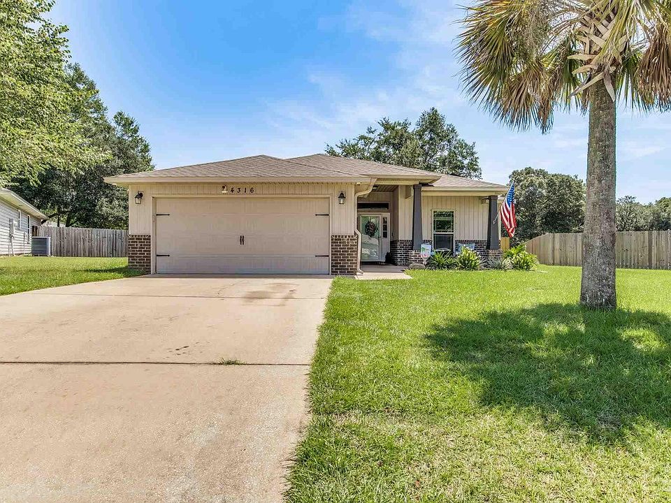 Charming & Energy-Smart Home in Pace! Tucked away on a quiet cul-de-sac in the desirable Woodlands subdivision, this 4-bedroom, 2-bath home offers 2,167 sq. ft. of comfortable living with modern upgrades throughout. Built in 2019, it combines everyday style with eco-friendly features, including fully paid-off solar panels that help keep energy costs low. From the moment you arrive, you’ll notice the home’s welcoming curb appeal, lush landscaping, and a beautifully maintained green yard. Inside, a sun-filled entryway welcomes you with double French doors leading to a flexible office or dining room on one side and a large laundry room on the other. The main living areas feature stylish LVP flooring, while all bedrooms are carpeted for comfort. The grand living room opens to a vaulted ceiling and a bright kitchen designed for gathering, complete with granite countertops, a large island, white shaker cabinets, stainless steel appliances, and a sunny breakfast nook big enough for a full table. Double doors lead to a screened-in porch with a ceiling fan, overlooking a large fenced backyard with mature trees and two storage sheds. The primary suite is a private retreat with a tray ceiling and a spa-like bathroom offering a soaking tub, separate shower, double vanities, and abundant natural light. Additional thoughtful touches include a climate-controlled garage, whole-home water filtration, a UV air purification system built into the AC, and a security system. Just steps away from the neighborhood park and splash pad, this home blends comfort, convenience, and charm in one of Pace’s most sought-after locations.