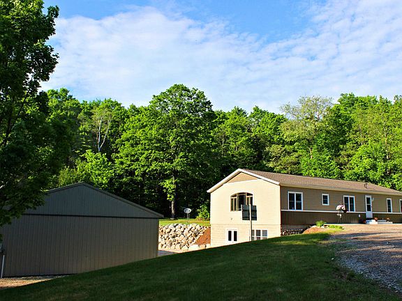 Country living at its best can be found in this well-maintained home. Twenty acres of beautiful hardwoods surround this sturdy property. Land is already surveyed and split between two equal parcels. Beautiful white oak finishes in living and dining room areas. Fantastic guest quarters on the lower level, complete with two bonus bedrooms and full bathroom. Garage heated by wood boiler, plumbed wash sink and upgraded insulation . The structure features studded walls and measures 30x60 feet. Nature, privacy, snowmobiling, hunting, gorgeous trees an overall sturdy property.