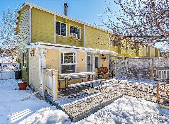 Hard to find end unit town home and one of only ten town homes nestled in a quiet neighborhood at the end of the road. The beautiful private backyard comes to life spring and summer time, backs up to open space and is shaded by large mature trees which makes for perfect spring and summer days while relaxing or hosting on your private deck . The backyard also features a large shed and covered vegetable garden. The town home is very well maintained, and features updated windows and kitchen. The garage is converted into an enclosed room. The HOA includes water, sewers, trash, hazard insurance and monthly reserve fee. Take a look, you won't be disappointed. Main floor bedroom could also be a master bedroom as there is a 3/4 bath.