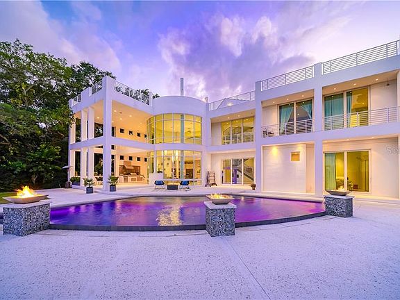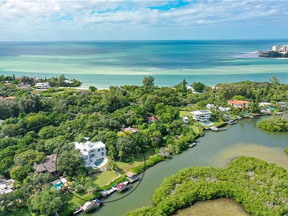 Resplendent with inspired modern design and true brilliance by renowned architect Mark Sultana, this architectural masterpiece has been celebrated as one of SRQ Magazine "Home of the Year". Located on the north end of Siesta Key deeply set on nearly 1 acre along the Coconut Bayou this 5-bedroom gated deep water-front estate abounds privacy and tropical splendor with a separate guest house and room for a tennis court. The excellence of craftsmanship strikes upon entry, with a breathtaking arrangement of glass, steel, sleek lines and soaring ceilings illuminated by a Lutron lighting system and surround sound audio throughout. Ascend the 3-story elevator or steel glass staircase to the 2500-sq.-ft. rooftop deck with jacuzzi overlooking Siesta Key, downtown Sarasota, and the waterways below, where a 16k lbs. boatlift, a double jet ski lift along with a kayak/paddleboard launch await your nautical adventures. The master suite boasts a morning kitchen, office/loft, exercise room, custom walk-in closets, and private balcony overlooking the Bayou. Entertain soirees of any size with the seamlessly flowing floor plan from the expansive ground floor living areas, including a separate movie theater room to tiered patios including exceptional outdoor summer kitchen, open saltwater pool and spa complete with the glow fire bowls. The is kitchen fabulous in form and function, with top-quality appliances, Italian custom cabinetry, butler pantry and separate wine cellar. Additional features include separate guest quarters, garage parking for 7 cars, and private gated deeded beach access looking at the Gulf of Mexico. Conveniently located near Out-of-Door Academy, Siesta Key Village, and #1 beach in America.