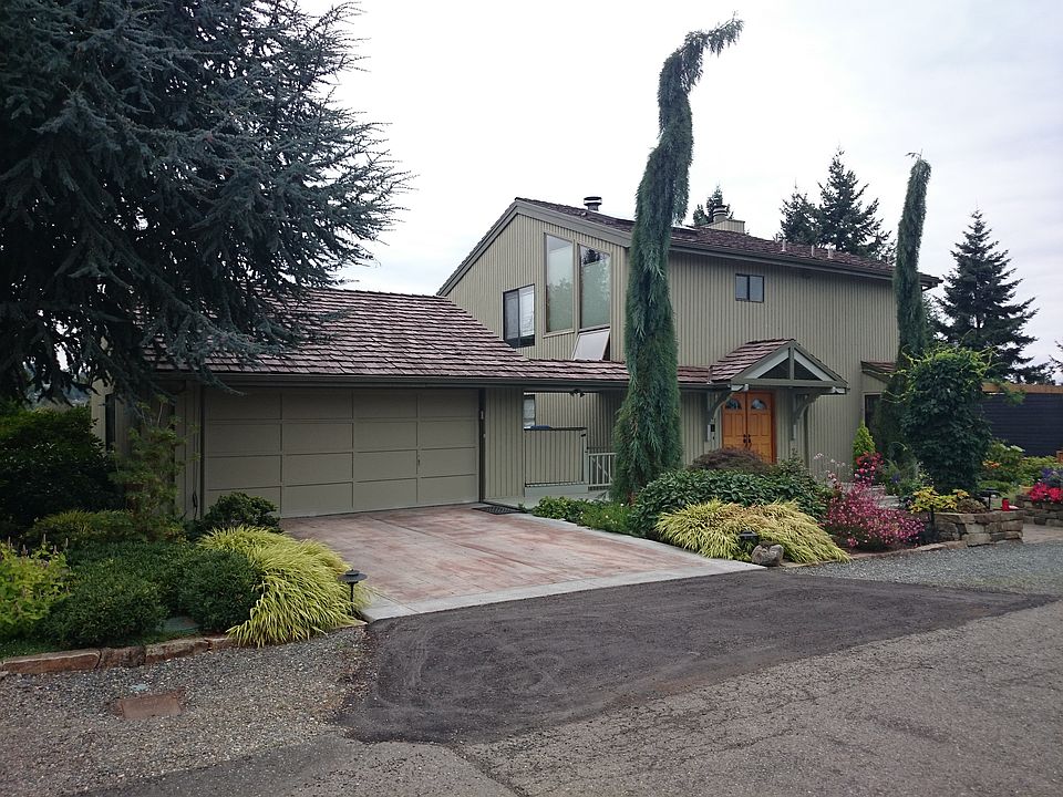 Sound and Mountain views from Lovely Contemporary home sited on private cul-de-sac, nestled into exquisite gardens w water feature. Circular floor plan on main flr is perfect for entertaining, kitchen w quartz countertops, subzero fridge walnut flrs, opens to lrg dining rm, living rm and deck. 2nd flr offers frpl in master bedrm and a view deck, en suite master bath and dressing rm, a cozy reading rm w frpl. Lwr level includes, media rm, wine taste rm, 2 bedrooms and laundry. 2 car garage w studio space!