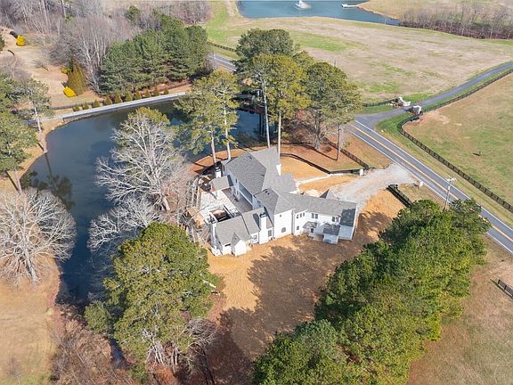 Stunning stone & brick new construction perfectly situated on 2 acres custom built by Savage Family Homes! The grand entry welcomes you with soaring 25-foot ceilings, a dramatic window-wall staircase and elegant arched doorways throughout the main level. Engineered wide-plank white oak floors, fluted white oak custom doors, and exposed beams in the vaulted family room create warmth and architectural interest. The family room is anchored by a stunning Indiana limestone fireplace. The chef's kitchen is a true showpiece with custom inset white oak cabinetry, marble countertops, herringbone wood-paneled ceiling and a center island with garden sink. A full suite of Sub-Zero and Wolf appliances is complemented by a fully equipped scullery featuring a steam oven, standard oven, warming drawer, second dishwasher and extensive storage. Entertain effortlessly in your formal dining room with wet bar and glass-enclosed wine display set against a striking stone feature wall. The private owner's suite on main is a serene retreat with a separate sitting area, private covered porch with gas fireplace and tranquil water views. The spa-inspired bath features his-and-her vanities, an arched frameless glass shower with dual shower heads, designer tile arched niches and a massive custom closet complete with ample hanging space, shoe display, handbag display and center island. This Outdoor living area rivals a luxury resort with a covered pool cabana featuring tongue-and-groove ceilings, Indiana limestone fireplace, pool bath, grill station with griddle, under-counter refrigerator and full wet bar. The 17x34 saltwater pebble pool with raised spa is surrounded by turf-inlay decking and a custom movie pavilion, creating the ultimate entertaining environment. The secondary level offers four spacious en-suite bedrooms, including one with a Juliette balcony overlooking the water, a dedicated study and a large unfinished space ready to be finished as a media room, loft, or home office. A rare opportunity to own a masterfully designed property offering privacy, luxury, and breathtaking views.