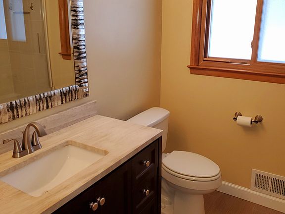 Well maintained south side ranch on a large wooded lot. Home features a completely remodeled bath room on the main level, 4 bedrooms, LR, DR and a half bath. There is a rec room, full bath and den/5th BR in the basement. There are hardwood floors throughout and a large eat in kitchen with ceramic flooring. All kitchen appliances included. Outside there is a large wooded yard with patio, shed and a front covered porch. The garage is heated and has a deionizing water filtration system to the hose bib. The home is situated on a quiet, dead end street. There is also a private well that supplies water to all exterior hose bibs. GLA, 1515 sq ft above grade living area. Approx. 681 sq ft below grade
