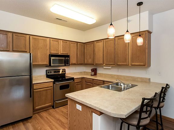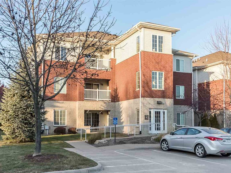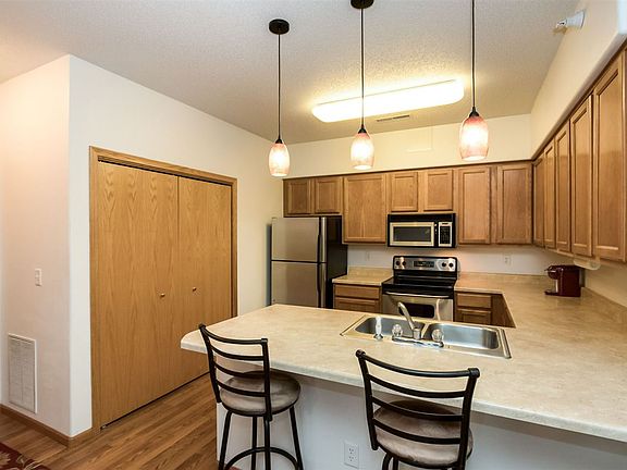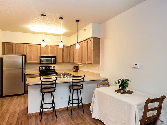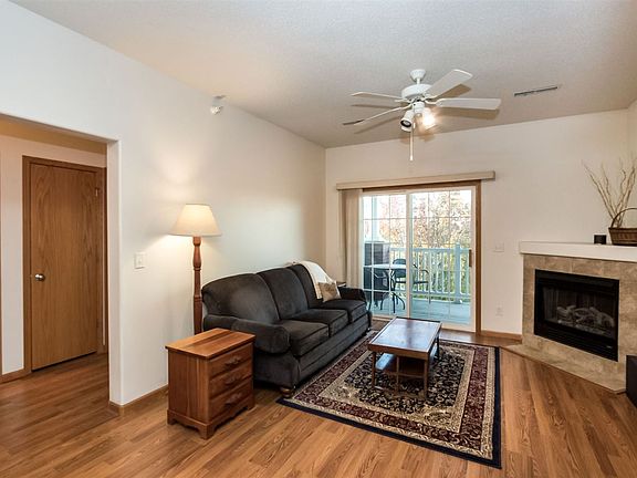 OPEN, third floor 2 BRM, 1 Bath Condo, 2 Car Garage, overlooking a green space/park in a quiet East side neighborhood close to walking trails. New laminate floors in Living Area. 9 foot ceilings, Gas Fireplace and Deck. The kitchen has plenty of counter space, a large Breakfast Bar with modern pendant lights, Stainless Steel GE appliances. Kit Stools,Washer & Dryer stay. Shelves above BR stool will stay. Next to BUS Line and a short drive to businesses and restaurants. Shelves in garage will stay too.