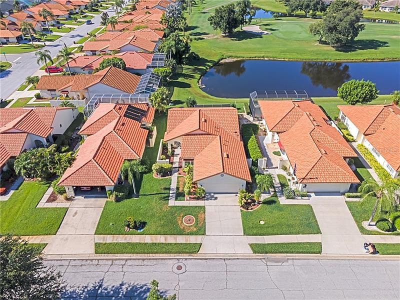 Are you looking for a relaxed lifestyle in a great location at a great price? You found it with this maintenance free home in Peridia Golf and Country Club. This home sits on one of the best lots on the street overlooking a pond and the golf course. The great room floorplan with vaulted ceilings and tile floors makes this home spacious and easy to maintain. As you approach the home through the privacy gate, a private front entry awaits. The master bedroom overlooks the golf course and has access to the lanai. Huge master bath with garden tub and separate shower. Second bedroom and Den have laminate flooring and Plantation shutters. Kitchen is spacious and has a slider to an outside patio great for a grill. Home has hurricane shutters and accordion shutters on the lanai. You will love to relax and watch the golfers from your private covered lanai. Peridia has a clubhouse, restaurant, community pool, tennis courts, an executive golf course, and is centrally located close to amenities and a short drive to the beautiful gulf beaches.