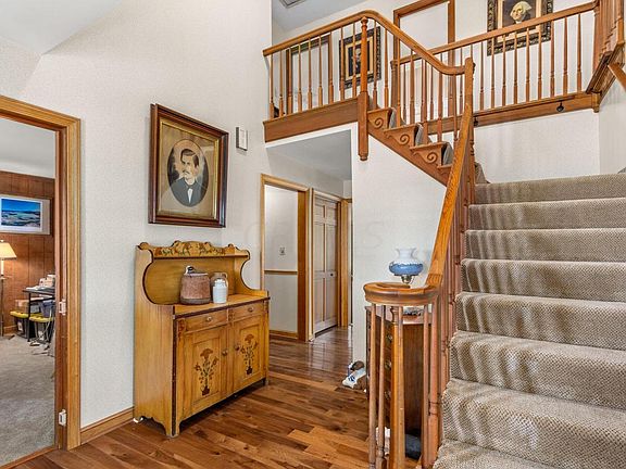 Custom built Colonial home on 2.5 acres with an unforgettable front porch lake view in Clear Fork Schools. Rough sawn cedar with brick accented exterior, covered front porch with decadent details & a back covered deck for evenings spent outside. As you walk in the front door, the hand carved banister will take your breath away as you experience the vaulted ceilings & hardwood flooring. Wood Pella windows throughout the home give you a front seat view to your own piece of paradise. Other highlights include: a main level office, 4 season room & a gated breezeway in between the attached extended 3 car garage & the home. 4 Car insulated detached garage, ideal for storage or starting a hobby!