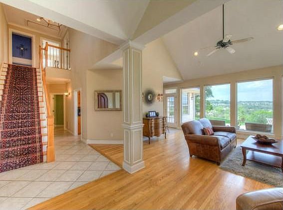 Outstanding vista lake and hill country views on a very private hilltop flat lot with a long private drive up from the gated stonewall entry. 180 degree views that will take your breathe away! Extended custom stone patio creates the entertaining area for bbq's and relaxing by the custom fire pit with spillover views. Wood floors in great room with cathedral ceilings and walls of windows featuring views. HOA lake access. Nothing like this one, it will go fast.