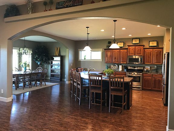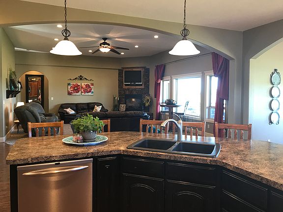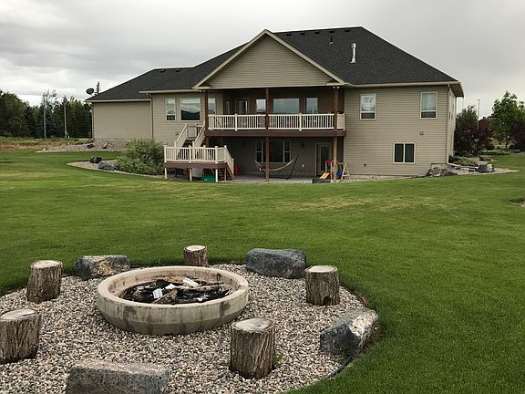 This welcoming 5068 square-foot home is uniquely set back off the main road with a long private paved driveway. The yard is beautifully landscaped with an amazing backyard boasting beautiful mountain views, a fire pit, two patios, and lots of space to play and create memories. The large open kitchen flows into the spacious great room. These areas are the heart of this home. The kitchen features an enormous pantry and an unattached bar that can seat up to seven people. Adjacent to the kitchen is a dining area with large windows overlooking the backyard. The great room exhibits a corner rock fireplace and access to the upper patio. This home has six bedrooms with the master on the main level. The master retreat features a gorgeous trayed ceiling and sitting area. There is an exterior door in the master suite to access the upper patio. The master bath is in the process of a remodel. It will have beautiful functional custom cabinetry, his and her sinks, a step up soaker tub, walk in shower, and toilet room. Off the master bath is a large walk in closet. In the walkout basement are the other five bedrooms with two full baths one being a Jack and Jill style. At the bottom of the stairs to the basement you step into a huge family room with large windows, an exterior door to the lower patio, and hook ups for a small bar/kitchen. Also located in the basement is a large utility/storage room. The back entry reveals a well-designed laundry and mudroom, five oversized custom lockers, and a half bath. The exterior of the home has been pressure washed and the stucco recently repainted. It is situated on 5 acres with water rights and an option to acquire additional property. There is limitless custom storage throughout this home and also an attached oversized three car garage big enough for all of your vehicles and toys. Come take a look at the possibilities that await you as you picture this home as your own.