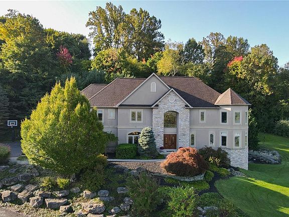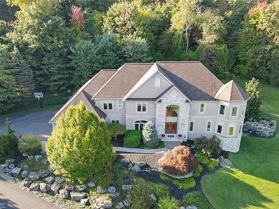 Perched high atop a hillside in Blue Ridge Estates this stately home has views that go on for miles. The 2-story foyer welcomes you flanked on either side by the living and dining rooms. This grand feel continues into the 2-story family room with stone fireplace and sky lights. The gourmet kitchen with GE Monogram & Bosch appliances serves as a focal point for entertaining. The 1st floor includes nanny or in-law quarters with a private bedroom, full bath and library. Upstairs, the master suit is the ideal retreat with fabulous views and a cozy 2-sided gas fireplace. 3 additional BR’s, 2 BA’s, a laundry room and a playroom complete the upstairs. The walk-out lower level allows for entertainment & relaxation featuring a theater room, gym, wet bar, rec room, workshop area and full bath. With 4964 SF on 2+ acres w/ a 4 car garage on public utilities in Southern Lehigh, this is a truly special place. Easy access to I-78 & PA turnpike & close to SVCC, Rails to Trails, Promenade Shops & more.