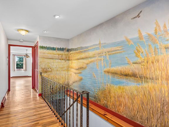 This pond front home is nestled in a majestic-like setting with loads of privacy and tranquil views of Blueberry Pond. An inviting foyer with painted mural of the local landscape welcomes you. The smart, open concept floor plan features 2 good size bedrooms and full bath on one side of the house, while the other side has the main floor bedroom on suite. As you enter into the wide open living area with sprawling wood floors take in the views of the pond and private landscape. Sit awhile as you cozy up to the wood burning fireplace. The original kitchen is functional with ample storage and leads to the deck for outdoor entertaining . Take the open staircase to the lower level family room with half bath, new flooring, built in cabinets, a wood stove and is a walkout to the yard. Other features are central AC, 2 car garage and generator.There is a small dock on the pond and direct access to the association recreation area from the property. Enjoy swimming, paddle boarding and kayaking. Bike path and First Light beach are conveniently nearby.